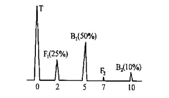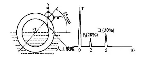 將探頭置于樣管上,找到人工缺陷,將一次通波B1調到5格,幅度為滿幅的90%,二次通波B2調到10格,幅度為滿幅的50%;—次缺陷波F1在2格處,幅度為滿幅的30%,二次缺陷波F2在7格處,幅度為滿幅的17%(圖1)。